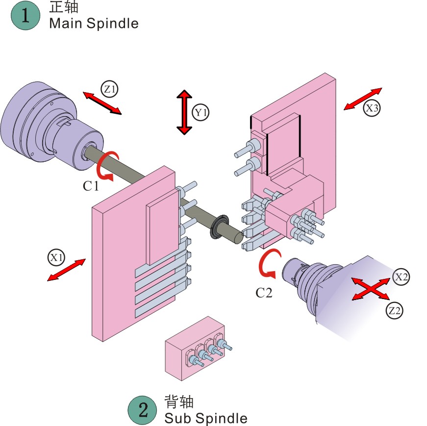 8、三通道控制方式,主軸端雙X軸控制兩把刀具同時與工件接觸,可實現(xiàn)兩側(cè)同時銑面、車削、打孔工藝,大大節(jié)省了加工效率。